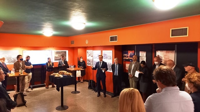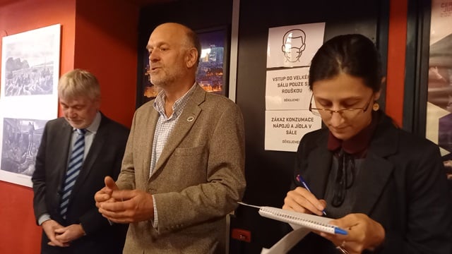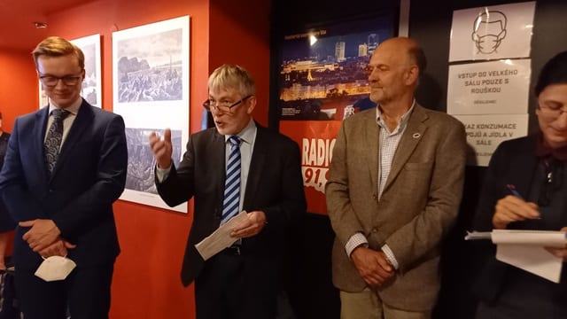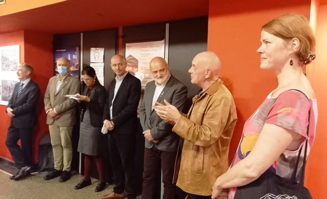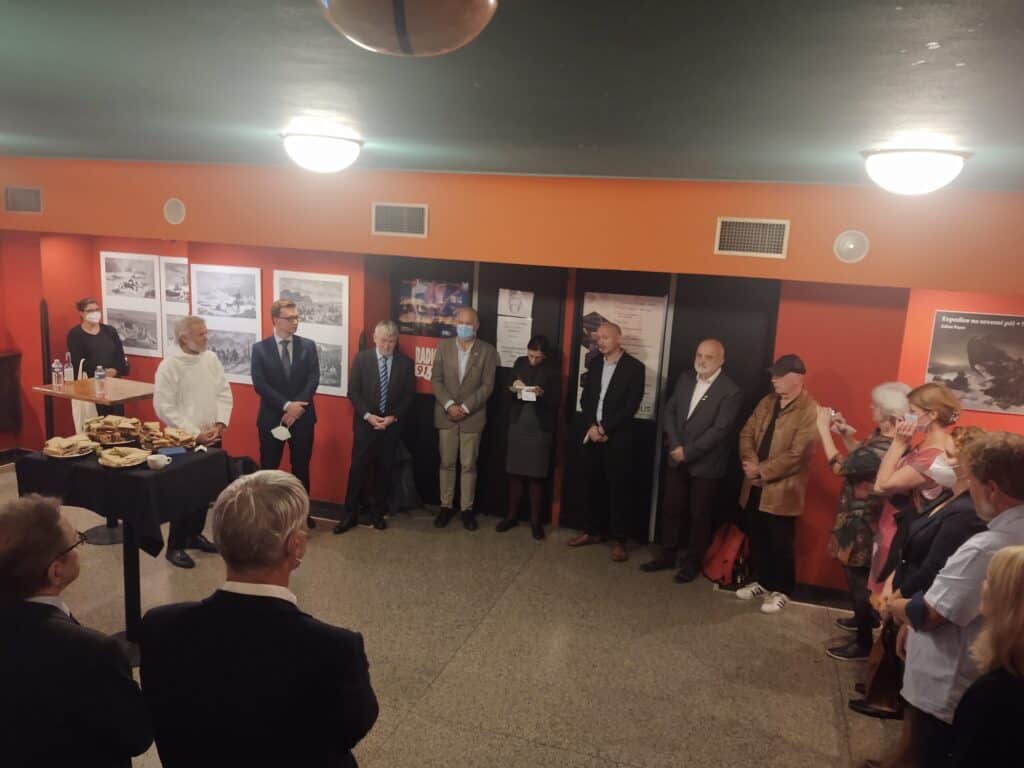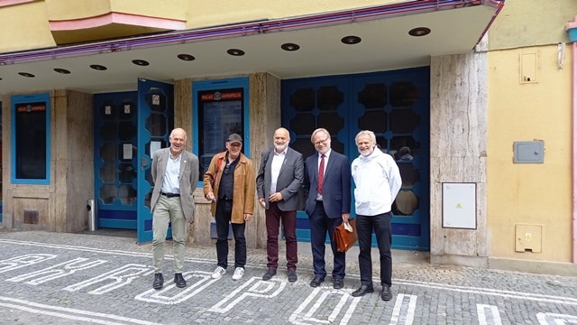 Meeting of the AF participants with their foreign guest in front of the Palace Akropolis (from left: Harald Steen – Norwegian Polar Institute, Hans-Olav Thyvold – Norwegian writer, Josef Elster – Centre for Polar Ecology of the University of South Bohemia, Václav Houfek – Director of the Municipal Museum in Ústí n/L, Zdeněk Lyčka – AF coordinator)